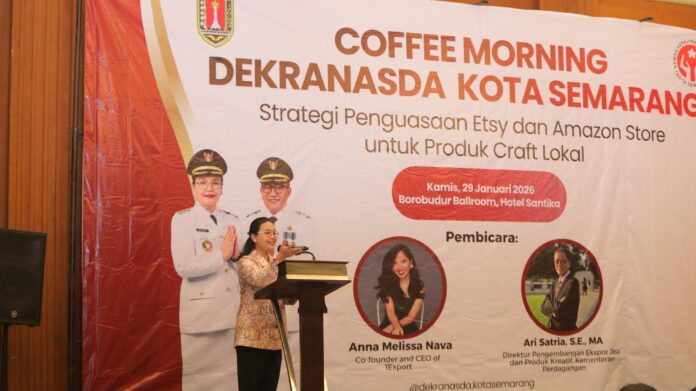 SEMARANG – Wali Kota Semarang, Agustina Wilujeng, menegaskan komitmen Pemerintah kota atau Pemkot Semarang untuk membawa produk kerajinan (craft) lokal Kota Semarang naik kelas ke kancah internasional. Hal tersebut disampaikannya dalam acara Coffee Morning Dekranasda Kota Semarang bertajuk “Strategi Penguasaan Etsy dan Amazon Store untuk Produk Craft Lokal” yang digelar di Hotel Santika Premiere belum lama ini.